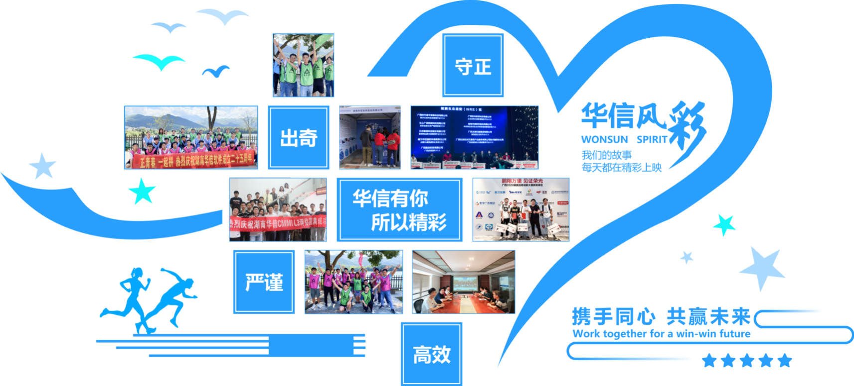 和諧友好的團(tuán)隊(duì):團(tuán)隊(duì)成員親如兄弟姐妹,相互幫助,相互理解,相互學(xué)習(xí)、相互支持;氛圍輕松的團(tuán)隊(duì):工作氛圍輕松、融洽;管理人性化的團(tuán)隊(duì):以人為本的個性化管理,定期舉辦交流活動、工作經(jīng)驗(yàn)交流會等。積極向上的團(tuán)隊(duì):守正、出奇、嚴(yán)謹(jǐn)、高效;個人職業(yè)規(guī)劃:重點(diǎn)挖掘員工個性,鼓勵自主創(chuàng)新、主動積極工作,注重企業(yè)與個人的雙贏戰(zhàn)略,制訂員工的職業(yè)生涯規(guī)劃。